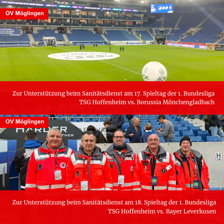 Am 17. Spieltag beim Spiel TSG Hoffenheim gegen Borussia Mönchengladbach sowie am 18. Spieltag gegen Bayer 04 Leverkusen unterstützten jeweils unterschiedliche Helfer den DRK-Ortsverein Sinsheim direkt am Spielfeldrand.